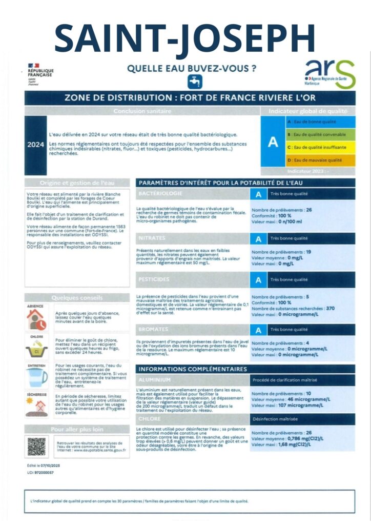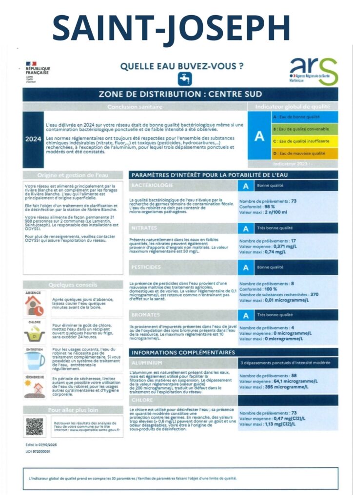 L’Agence Régionale de Santé (ARS) a publié les résultats 2024 sur la qualité de l’eau distribuée à Saint-Joseph.