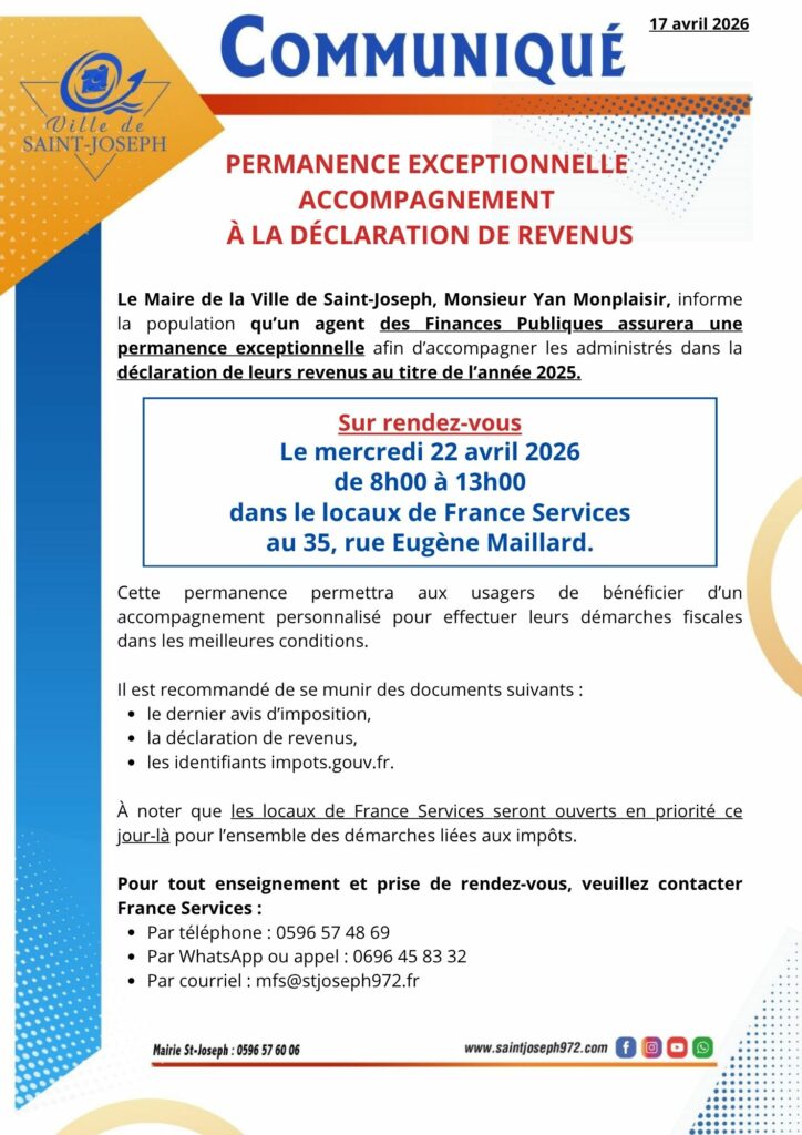 Le Maire de la Ville de Saint‑Joseph, Monsieur Yan Monplaisir, informe la population qu’un agent des Finances publiques sera exceptionnellement présent pour accompagner les usagers dans leurs démarches de déclaration des revenus 2025, le Mercredi 22 avril 2026 de 8h00 à 13h00