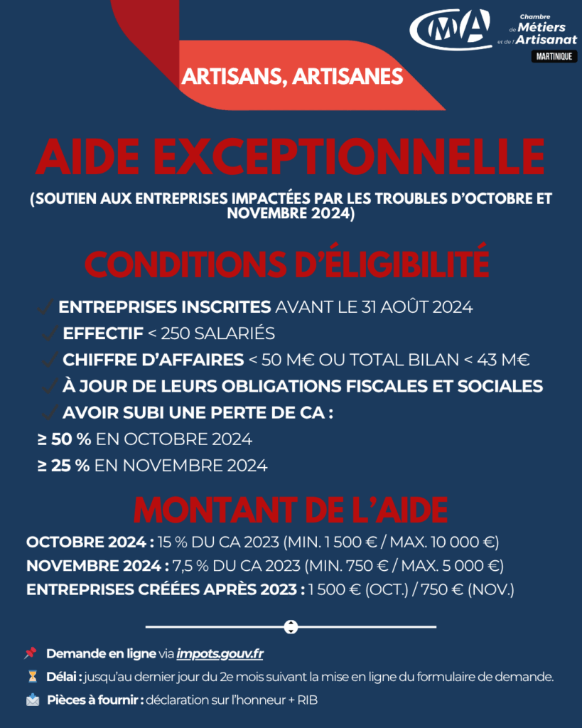 La Chambre de Métiers et de l’Artisanat de Martinique informe les artisans et artisanes de la mise en place d’une aide exceptionnelle destinée à soutenir les entreprises ayant subi une perte d’activité en raison des troubles survenus en octobre et novembre 2024.