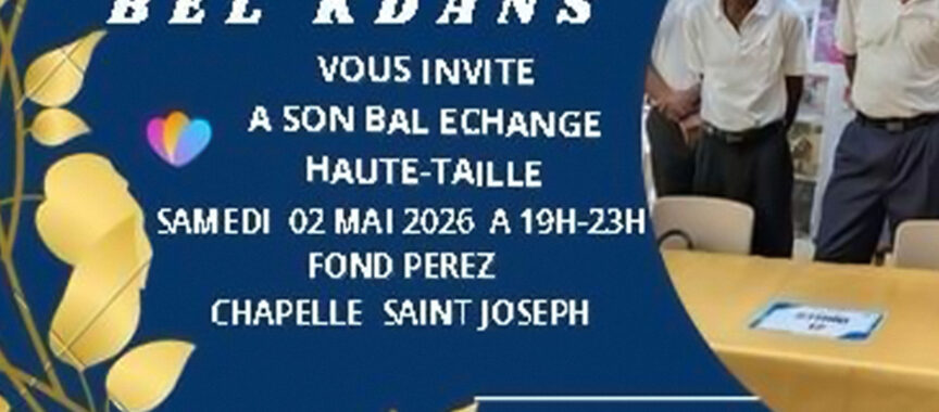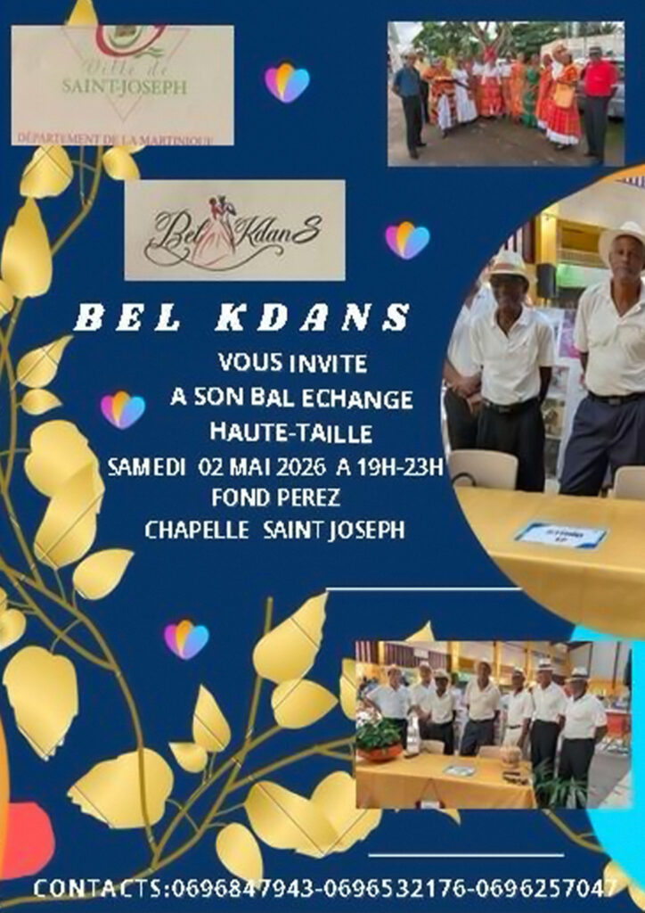 L’association Bel Kdans, avec le soutien de la Ville de Saint‑Joseph, convie la population à un bal échange haute‑taille qui se tiendra le samedi 2 mai 2026, de 19h à 23h, à Fond Pérez – Chapelle, à Saint‑Joseph.