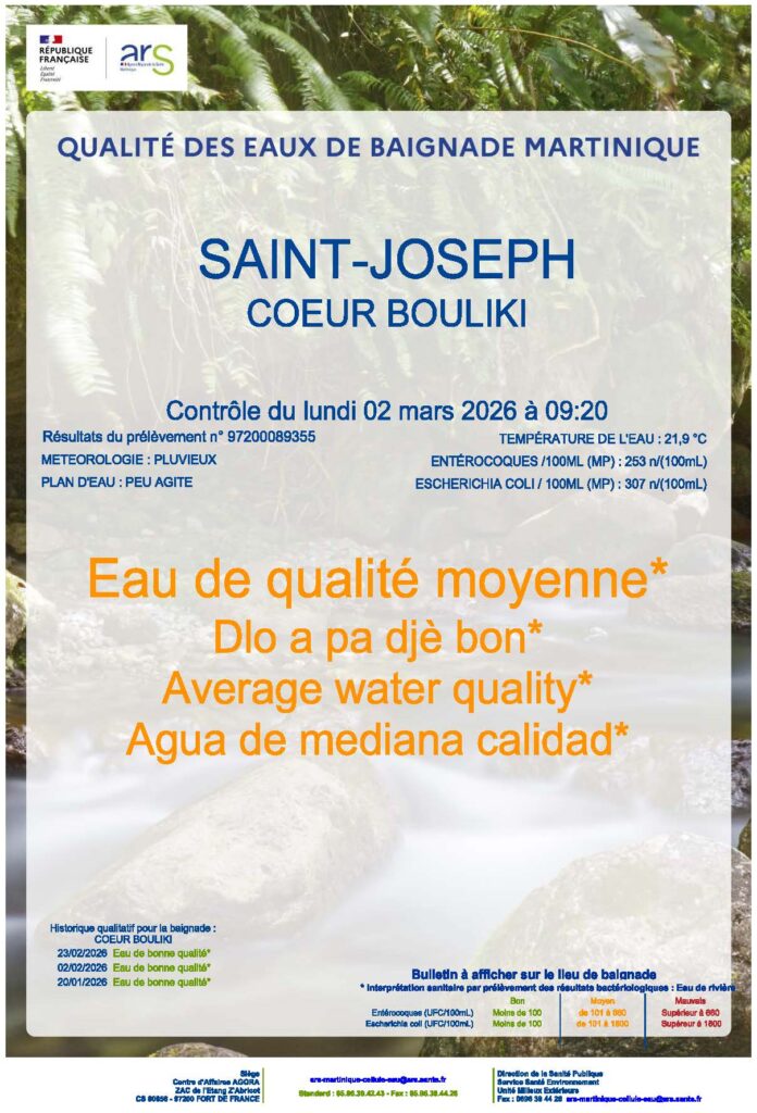 L’ARS Martinique informe que la qualité de l’eau de baignade à Cœur Bouliki est actuellement moyenne.