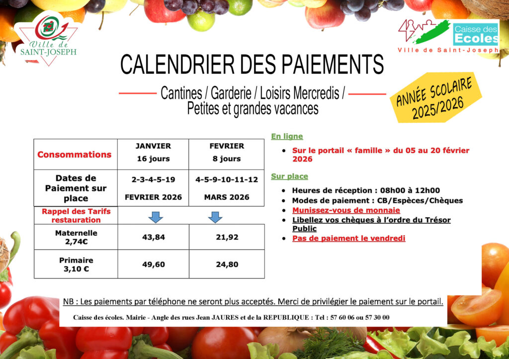 CALENDRIER DES PAIEMENTS DES PRESTATIONS SCOLAIRES POUR JANVIER ET FÉVRIER 2026