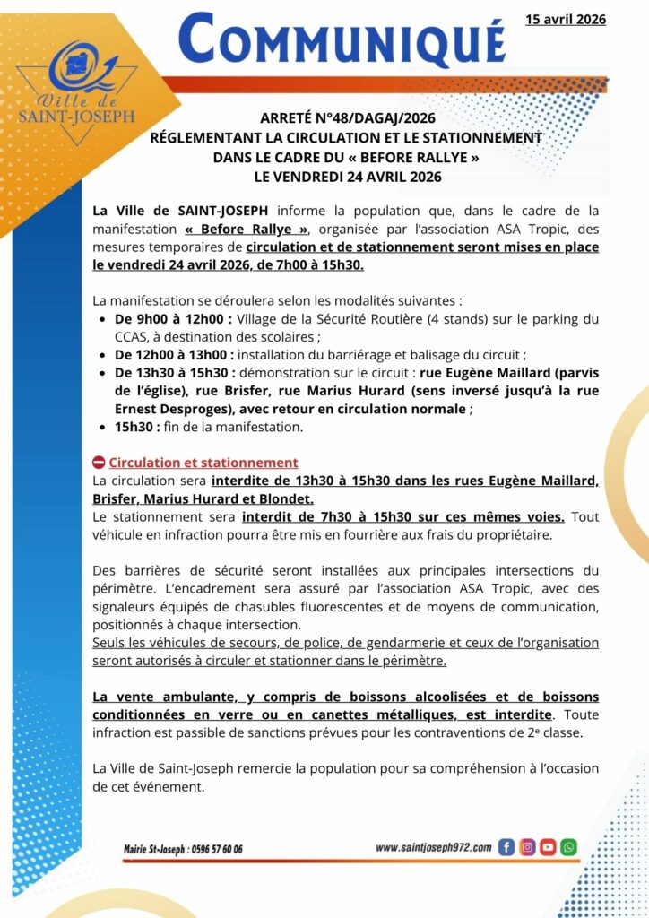 La Ville de Saint‑Joseph informe la population que, dans le cadre de la manifestation « Before Rallye », organisée par l’association ASA Tropic, des restrictions temporaires de circulation et de stationnement seront appliquées le vendredi 24 avril 2026, de 7h à 15h30.