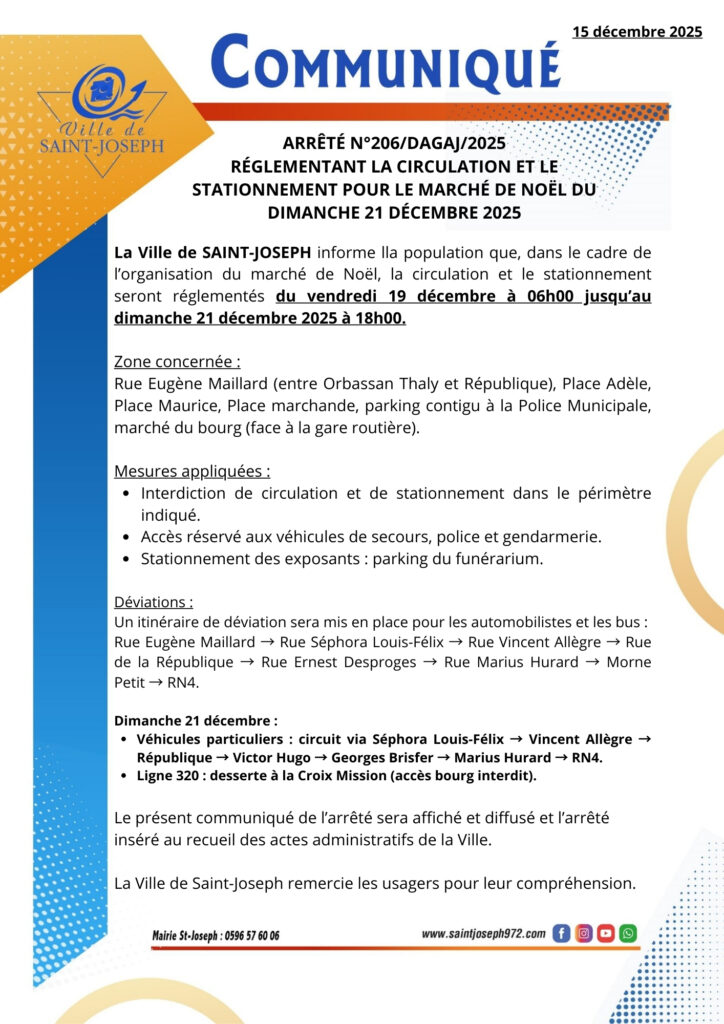 La Ville de Saint-Joseph informe la population qu’en raison du Marché de Noël du dimanche 21 décembre 2025 au bourg, la circulation et le stationnement seront perturbés.
