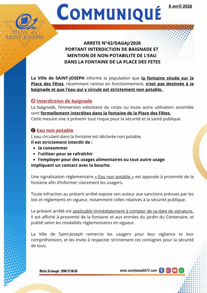 La Ville de Saint‑Joseph informe la population que la fontaine située sur la Place des Fêtes, récemment remise en fonctionnement, n’est pas destinée à la baignade et que l’eau qui y circule est strictement non potable.