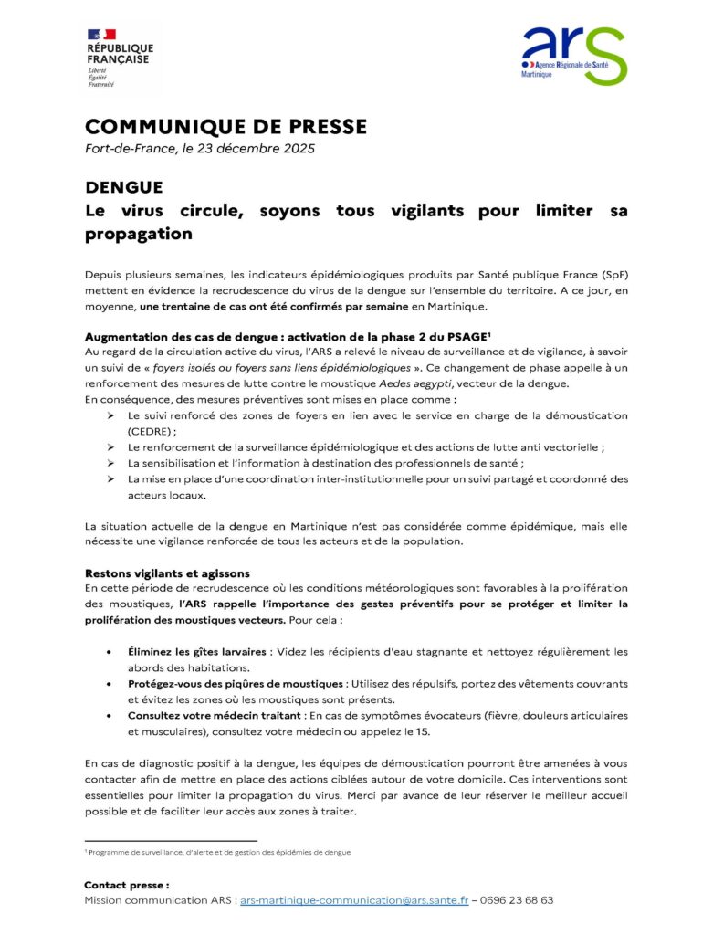 L’ARS Martinique informe que le virus de la dengue circule activement sur notre territoire, avec une trentaine de cas confirmés chaque semaine.