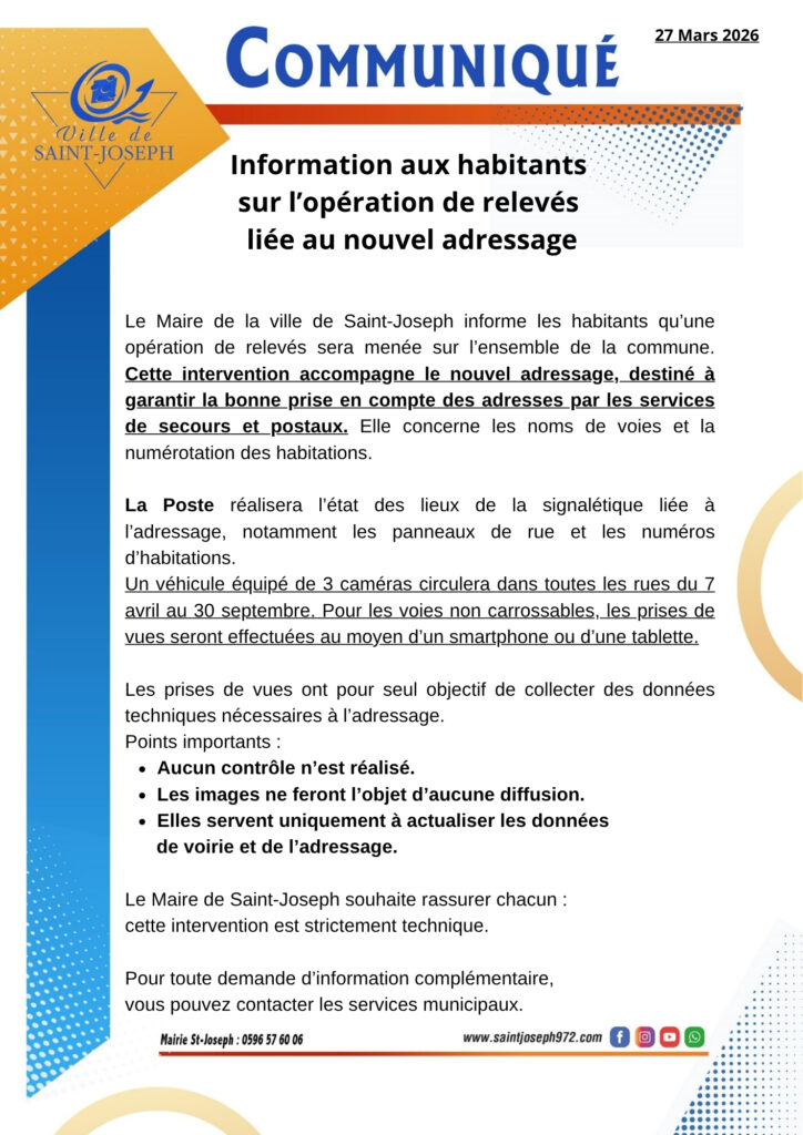 La Ville de Saint‑Joseph informe les habitants qu’une opération de relevés est actuellement menée sur l’ensemble du territoire communal dans le cadre du nouvel adressage.