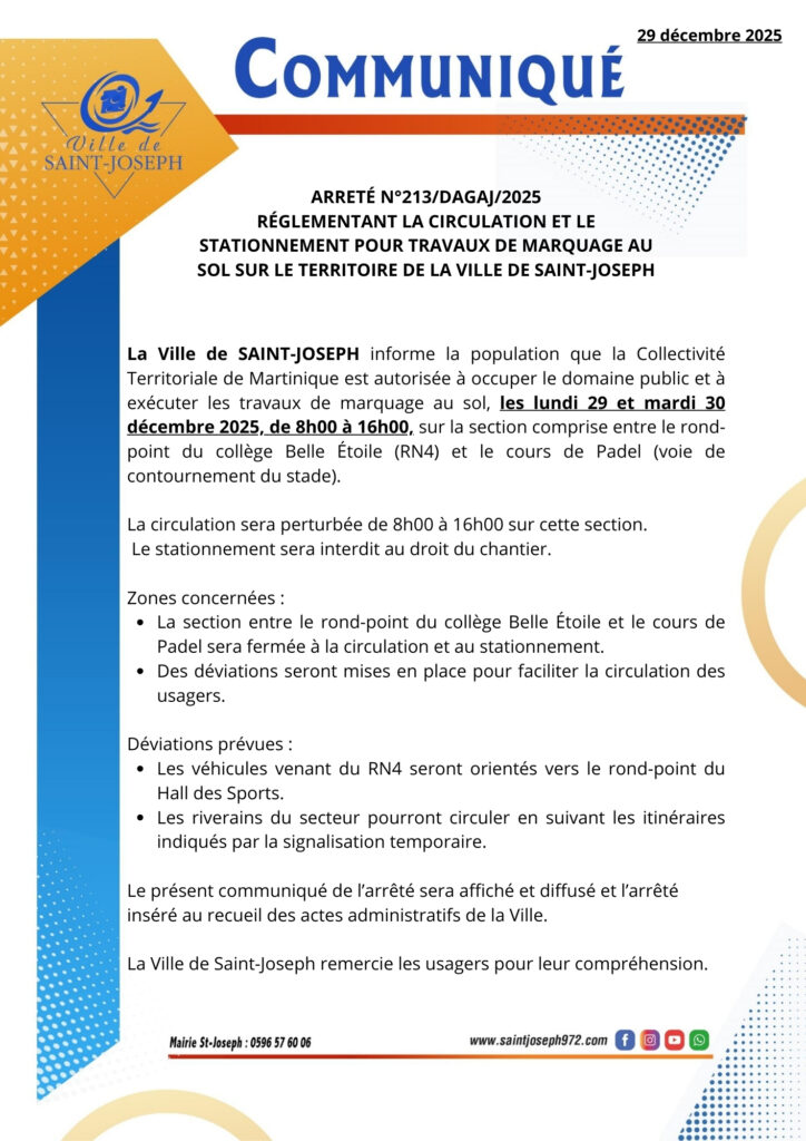 La Ville de Saint-Joseph informe la population qu’en raison de travaux de marquage au sol, du lundi 29 au mardi 30 décembre 2025, la circulation et le stationnement seront perturbés entre le rond-point du collège de Belle étoile et le terrain de Padel.