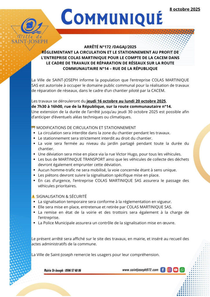 La Ville de Saint-Joseph informe la population des mesures de régulation de la circulation et du stationnement, mises en place pour la réalisation de travaux de réparation de réseaux, à compter du mercredi 16 au 20 octobre 2025, sur la route communautaire n°14 – Rue de la république.