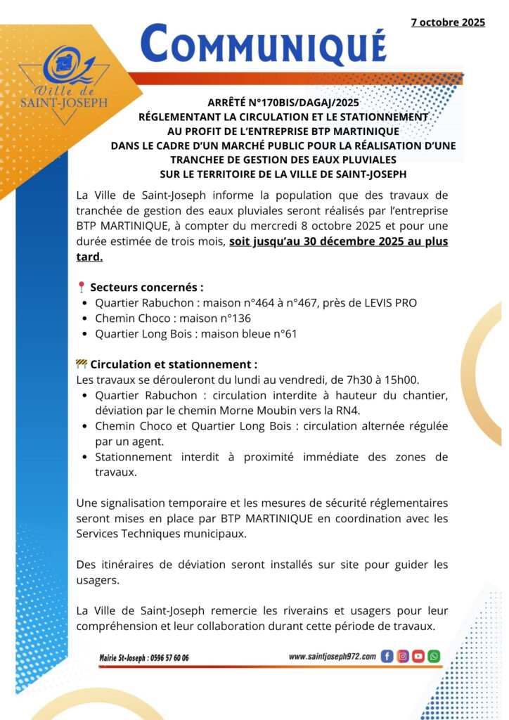 La Ville de Saint-Joseph informe la population des mesures de régulation de la circulation et du stationnement, mises en place pour la réalisation de travaux de tranchée de gestion des eaux pluviales, à compter du mercredi 8 octobre 2025 au 30 décembre 2025, sur la commune.