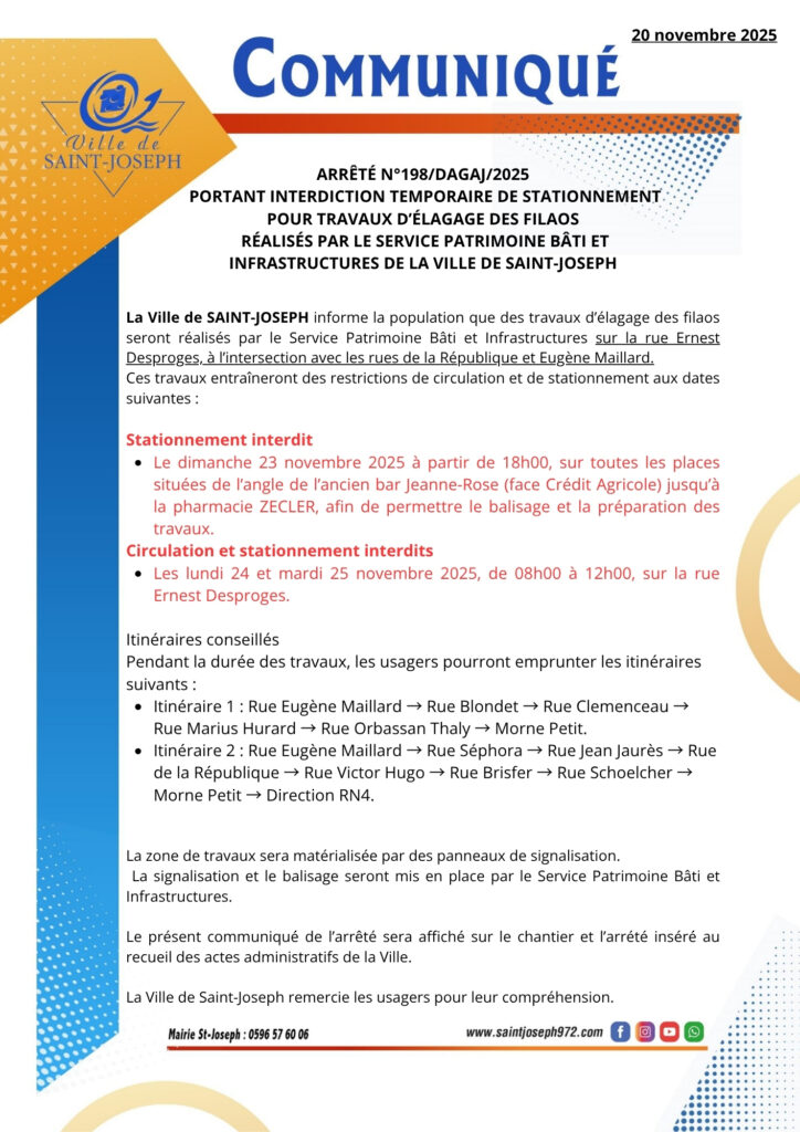 La Ville de Saint-Joseph informe la population que des travaux d’élagage des filaos seront réalisés sur la rue Ernest Desproges, à l’intersection avec les rues de la République et Eugène Maillard.