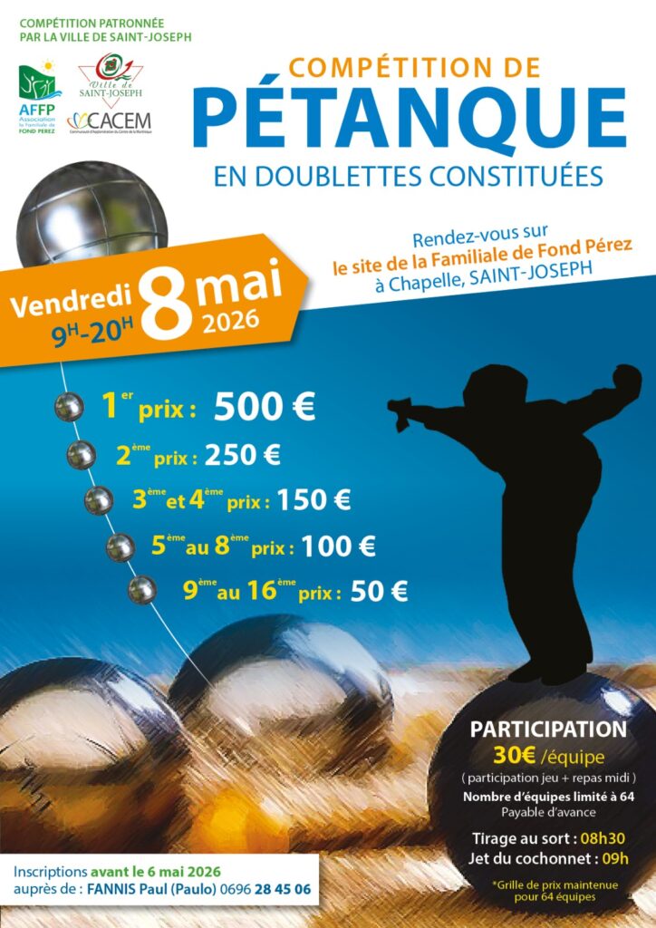 La Ville de Saint‑Joseph, en partenariat avec l’Association Familiale de Fond Pérez (AFFP) et la CACEM, parraine une compétition de pétanque en doublettes constituées qui se tiendra le vendredi 8 mai 2026, de 9h à 20h, sur le site de la Familiale de Fond Pérez, à Chapelle – Saint‑Joseph.