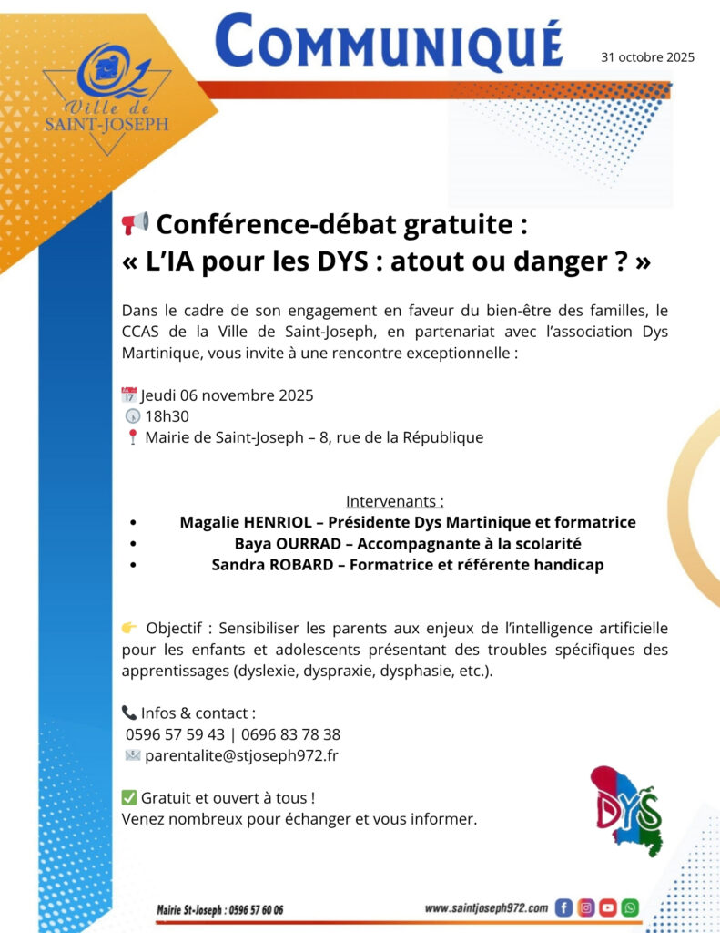 Le CCAS de la Ville de Saint-Joseph, en partenariat avec l’association Dys Martinique, organise une conférence-débat gratuite sur un sujet d’actualité : « L’intelligence artificielle pour les DYS : atout ou danger ? » le Jeudi 6 novembre 2025 à 18h30 en Salle des délibérations – Mairie de Saint-Joseph (8, rue de la République).
