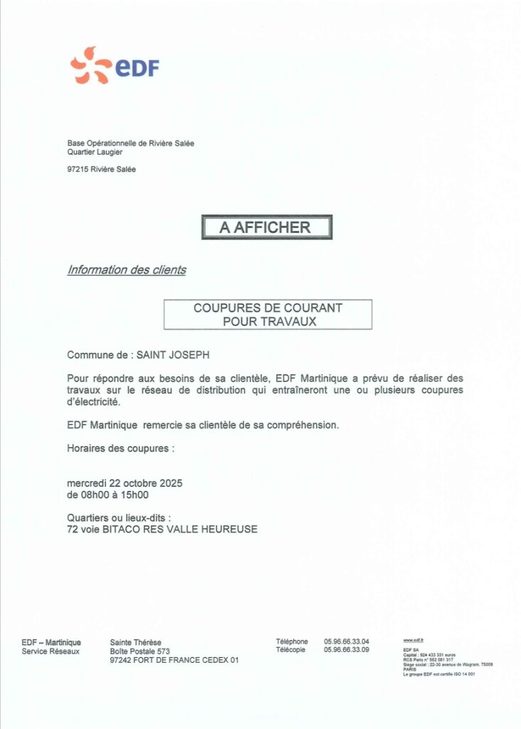 EDF informe la population qu’une coupure d’électricité interviendra le mercredi 22 octobre 2025 entre 07h50 et 15h25, en raison de travaux d’entretien du réseau électrique.