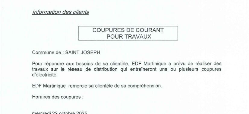 EDF informe la population qu’une coupure d’électricité interviendra le mercredi 22 octobre 2025 entre 07h50 et 15h25, en raison de travaux d’entretien du réseau électrique.