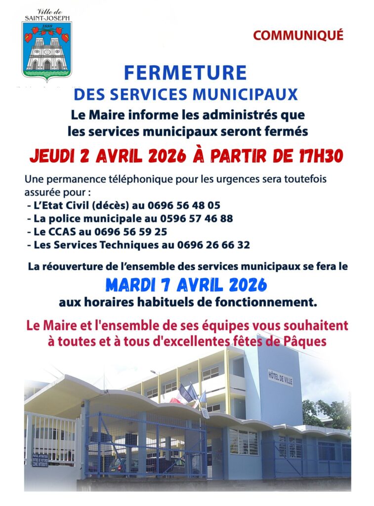 Le Maire de la Ville de Saint‑Joseph informe les administrés que l’ensemble des services municipaux sera fermé à compter du jeudi 2 avril 2026 à partir de 17h30, à l’occasion des fêtes de Pâques.