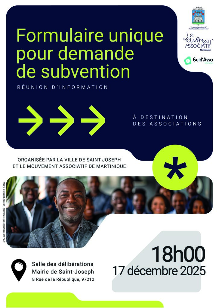 La Ville de Saint-Joseph, en partenariat avec Le Mouvement Associatif de Martinique, organise une réunion d’information destinée aux associations afin de présenter le formulaire unique pour demande de subvention.