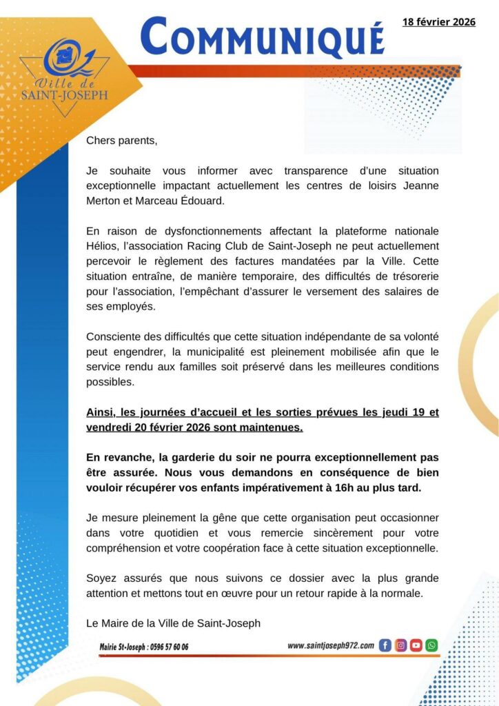 Les centres de loisirs Jeanne Merton et Marceau Édouard sont bien ouverts et les journées d’accueil ainsi que les sorties prévues les jeudi 19 et vendredi 20 février 2026 sont maintenues.