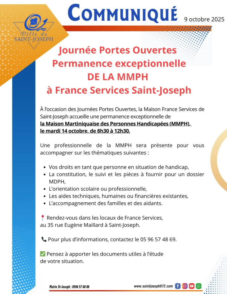 Dans le cadre des Journées Portes Ouvertes, la Maison France Services de Saint-Joseph accueille une permanence exceptionnelle de la Maison Martiniquaise des Personnes Handicapées (MMPH), le mardi 14 octobre 2025, de 8h30 à 12h30.
