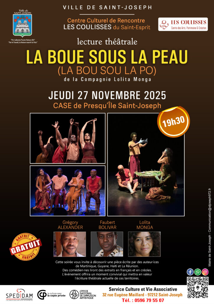 Le Centre Culturel de Rencontre Les Coulisses du Saint-Esprit, en partenariat avec la Ville de Saint-Joseph, vous invite à une soirée exceptionnelle autour de la lecture théâtrale « La Boue sous la Peau » (La Bou Sou La Po), présentée par la Compagnie Lolita Monga, le Jeudi 27 novembre 2025, 19h30