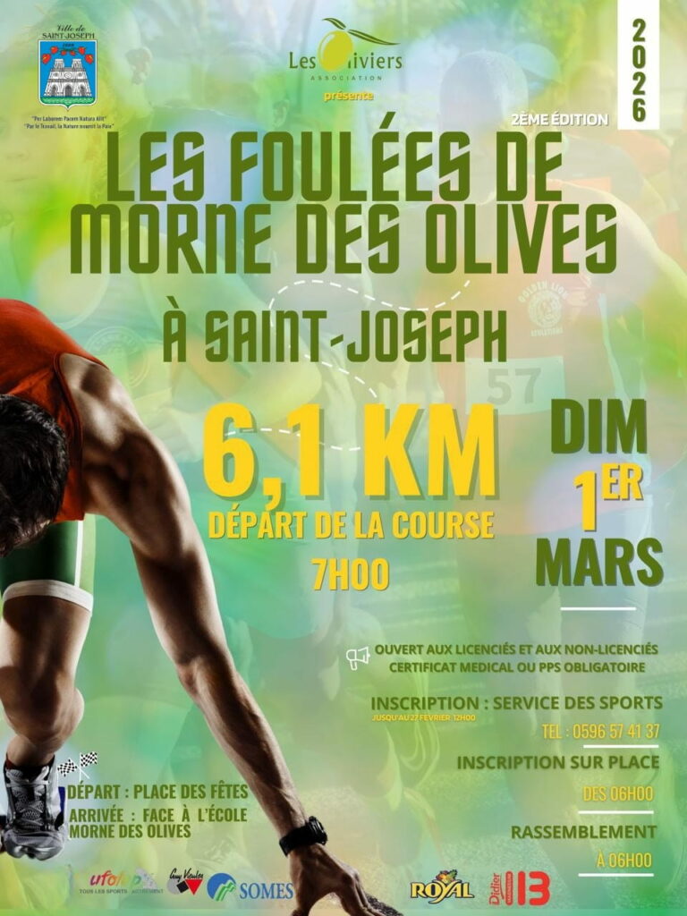L’association les Oliviers, en partenariat avec le Service des Sports de la Ville de Saint-Joseph, vous invite à la deuxième édition des « FOULEES DE MORNE DES OLIVES« , le dimanche 1er mars 2026 pour un parcours de 6,1 km de course.
