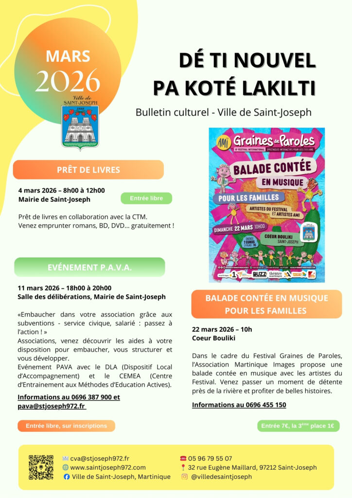La Ville de Saint-Joseph a le plaisir de vous présenter la Newsletter Culture “Dé ti nouvel pa koté LAKILTI” pour le mois de mars.
