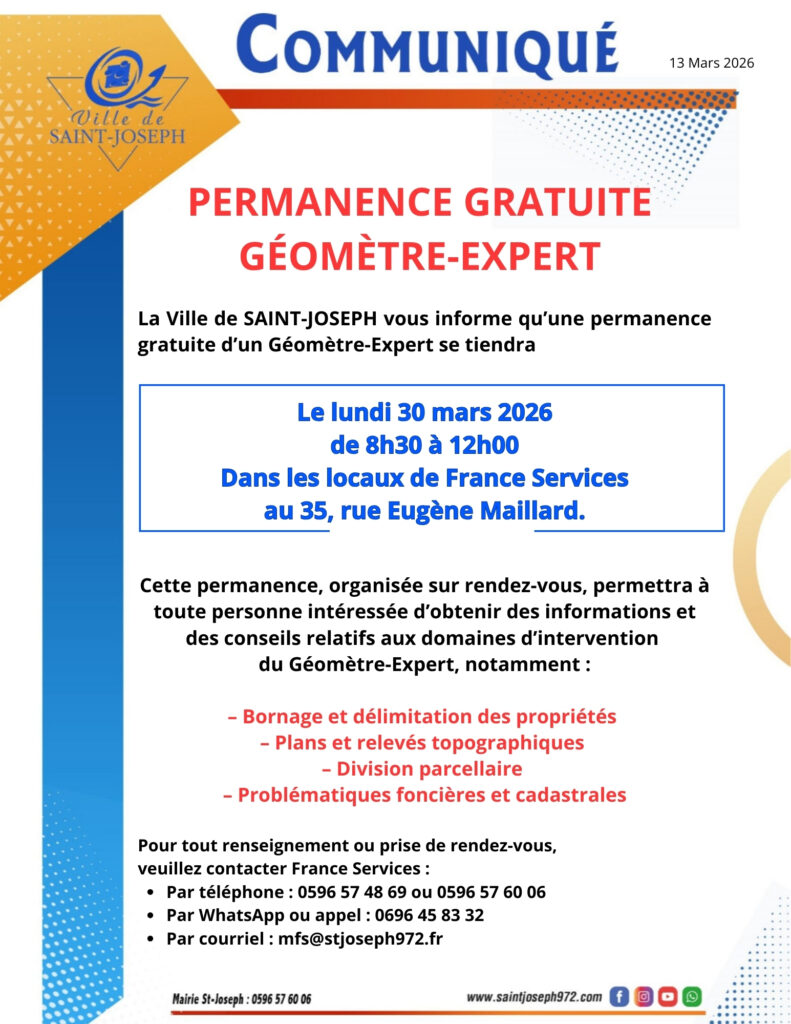 La Ville de Saint-Joseph vous propose une permanence gratuite avec un Géomètre-Expert le lundi 30 mars 2026 de 8h30 à 12h à Maison France Services, au 35 rue Eugène maillard.