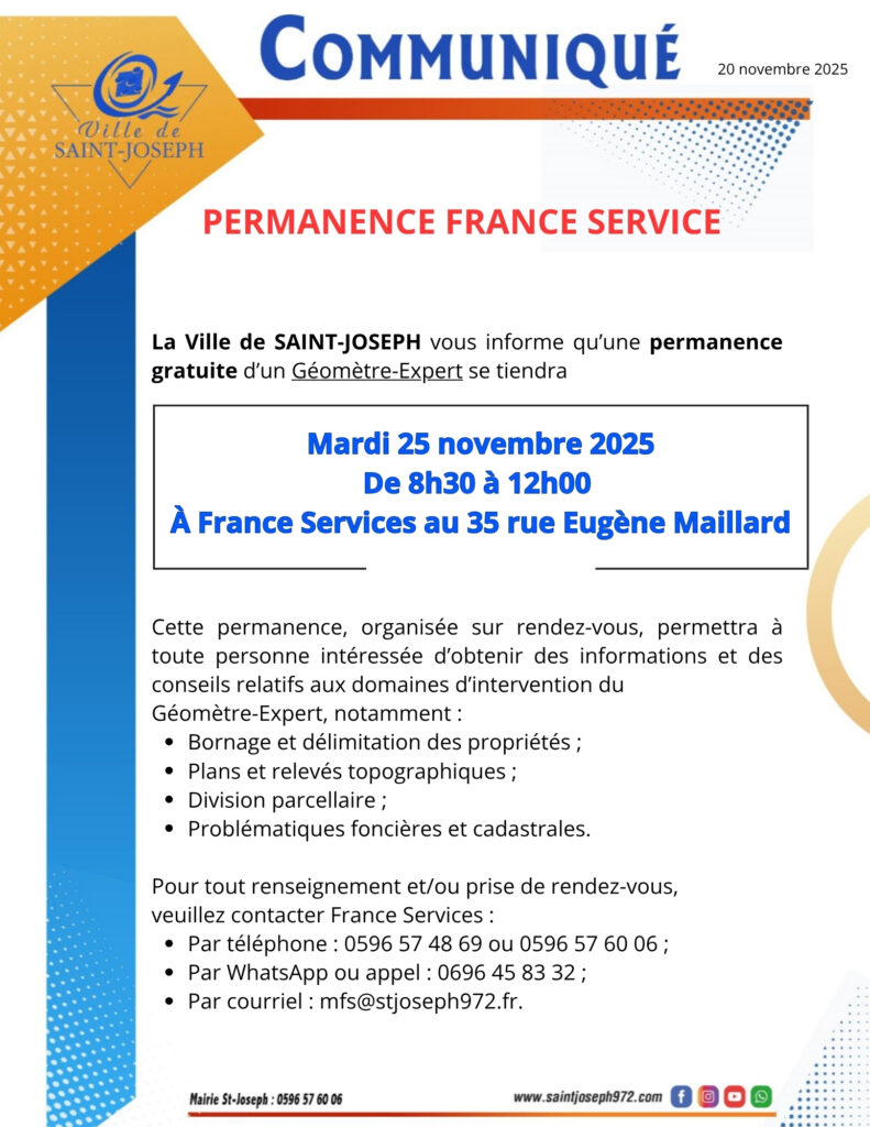 La Ville de Saint-Joseph vous propose une permanence gratuite avec un Géomètre-Expert le mardi 25 novembre 2025 de 8h30 à 12h à Maison France Services, au 35 rue Eugène maillard.