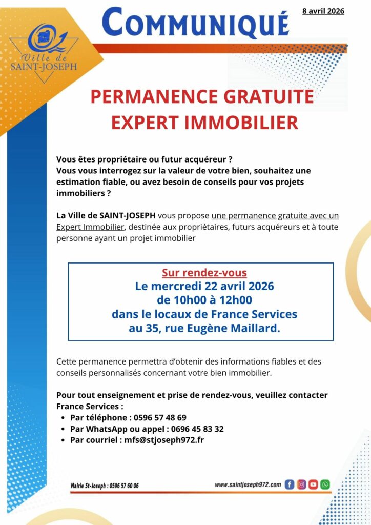 La Ville de Saint‑Joseph organise une permanence gratuite avec un expert immobilier le mercredi 22 avril 2026, de 10h00 à 12h00, dans les locaux de France Services, situés au 35, rue Eugène Maillard.