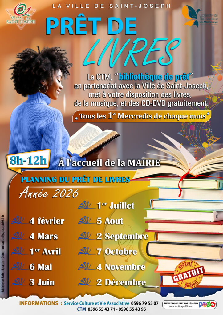 Envie de découvrir de nouvelles lectures ou d’emporter de la musique et des CD-DVD chez vous ? La Ville de Saint-Joseph, en partenariat avec la CTM Collectivité Territoriale de Martinique, vous propose un service de prêt gratuit au sas de l’accueil de la Mairie, chaque 1er mercredi du mois de 8h à 12h.