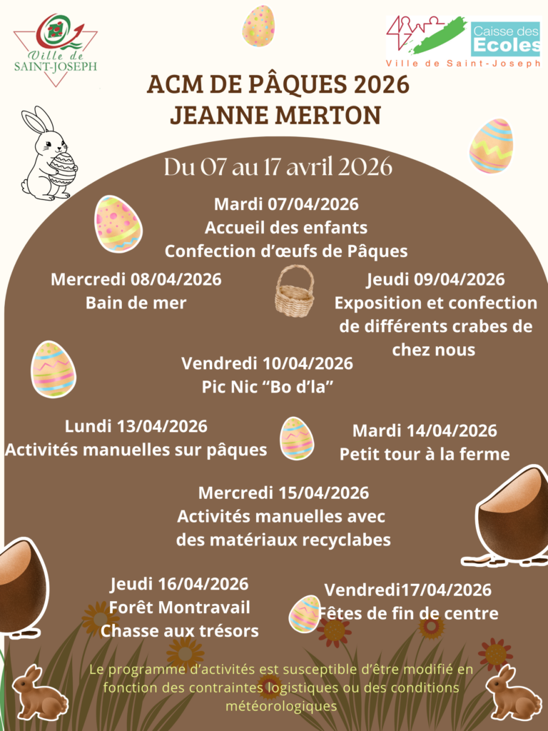 La Caisse des Écoles de la Ville de Saint-Joseph, vous propose les programmes d’activités des Centres ACM pour les vacances de Pâques du mardi 7 au vendredi 17 avril 2026.