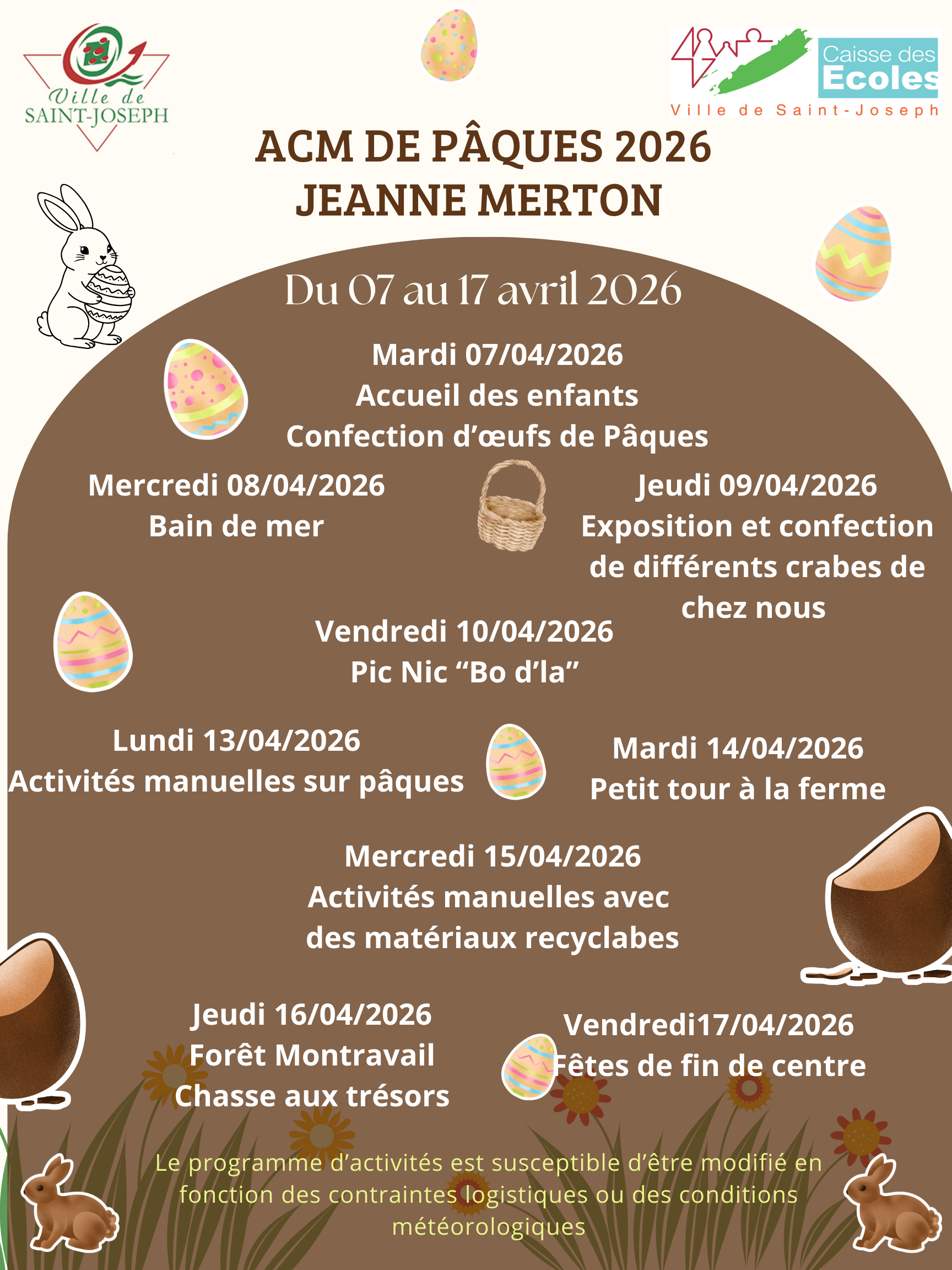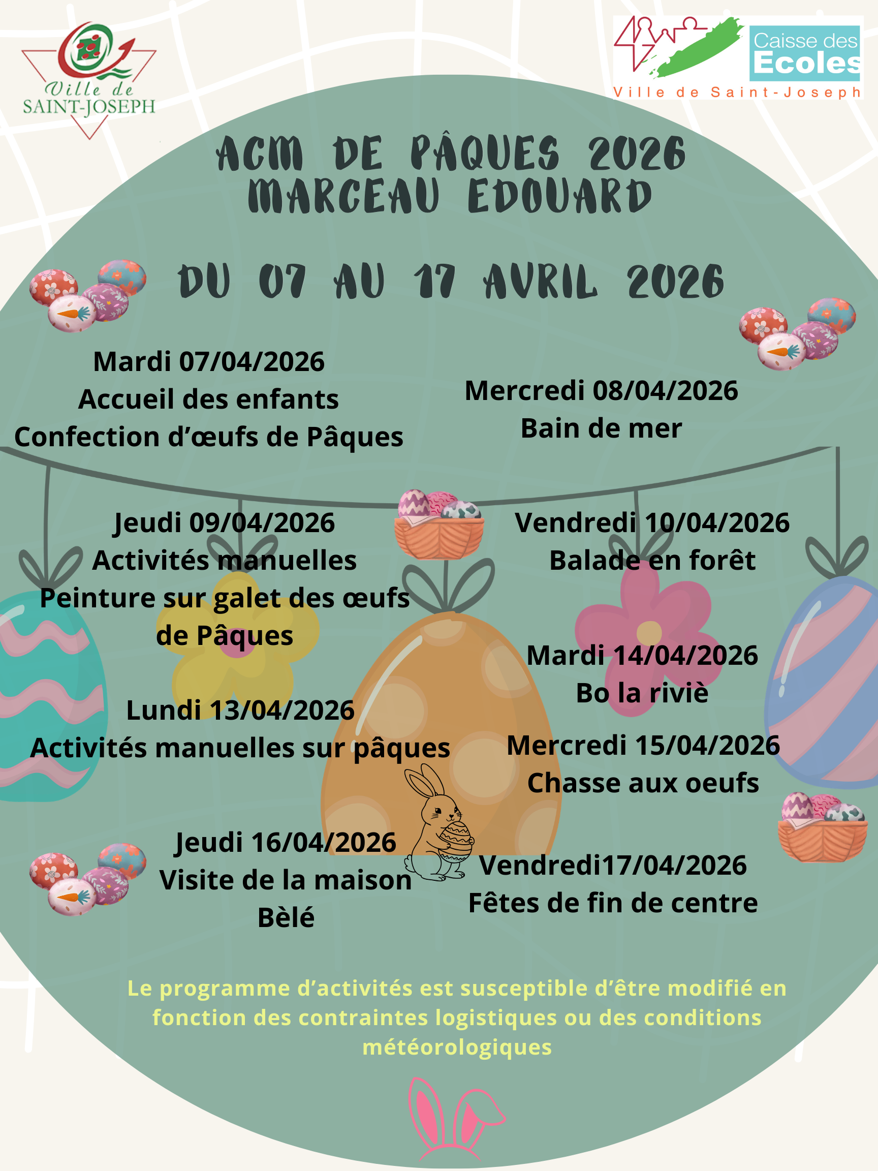 La Caisse des Écoles de la Ville de Saint-Joseph, vous propose les programmes d’activités des Centres ACM pour les vacances de Pâques du mardi 7 au vendredi 17 avril 2026.