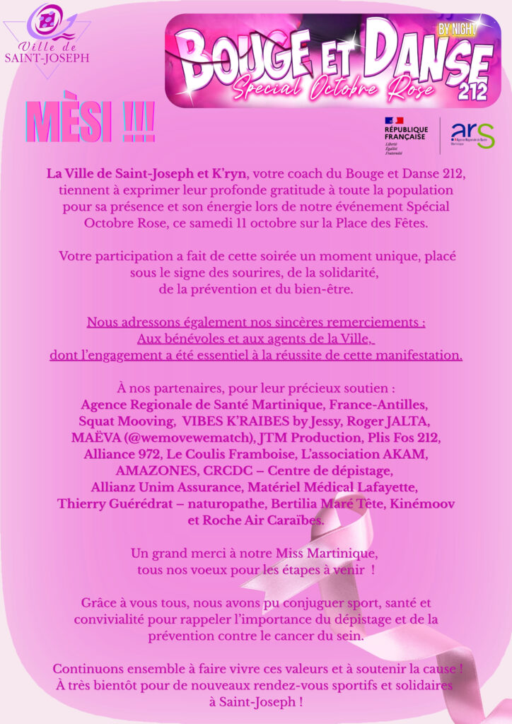 Merci à toutes et à tous pour votre énergie et votre présence lors de notre dernier rendez-vous Bouge et Danse 212 spécial Octobre rose. Grâce à vous, cet événement a été un moment unique, placé sous le signe du sport, du bien-être et de la convivialité.
