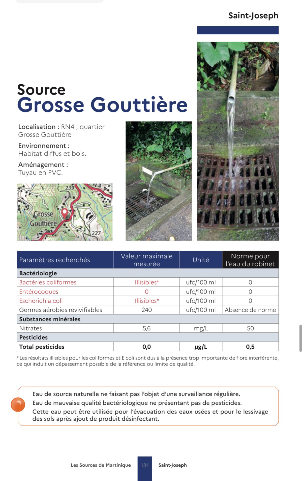 Cette eau ne fait pas l’objet d’une surveillance régulière et ne doit pas être utilisée pour la consommation. Elle peut servir à des usages non alimentaires (arrosage, nettoyage).