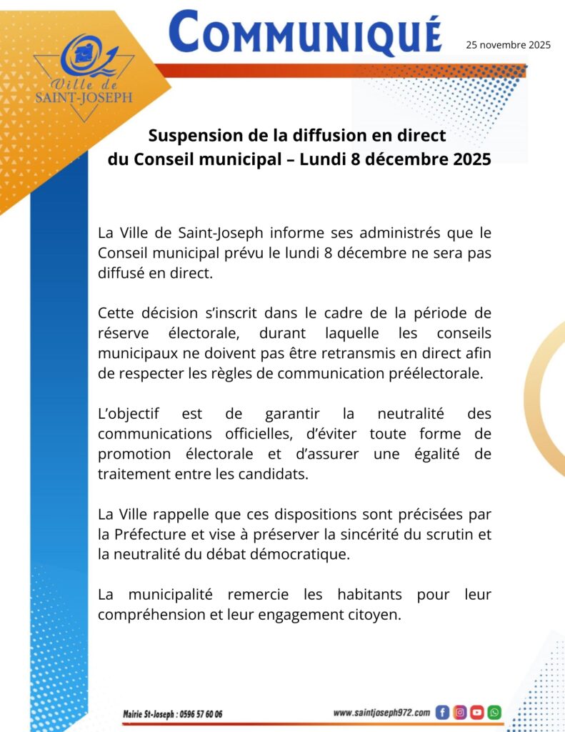 La Ville de Saint-Joseph informe ses administrés que le Conseil municipal prévu le 8 décembre 2025 ne sera pas diffusé en direct. Cette décision s’inscrit dans le cadre de la période de réserve électorale.