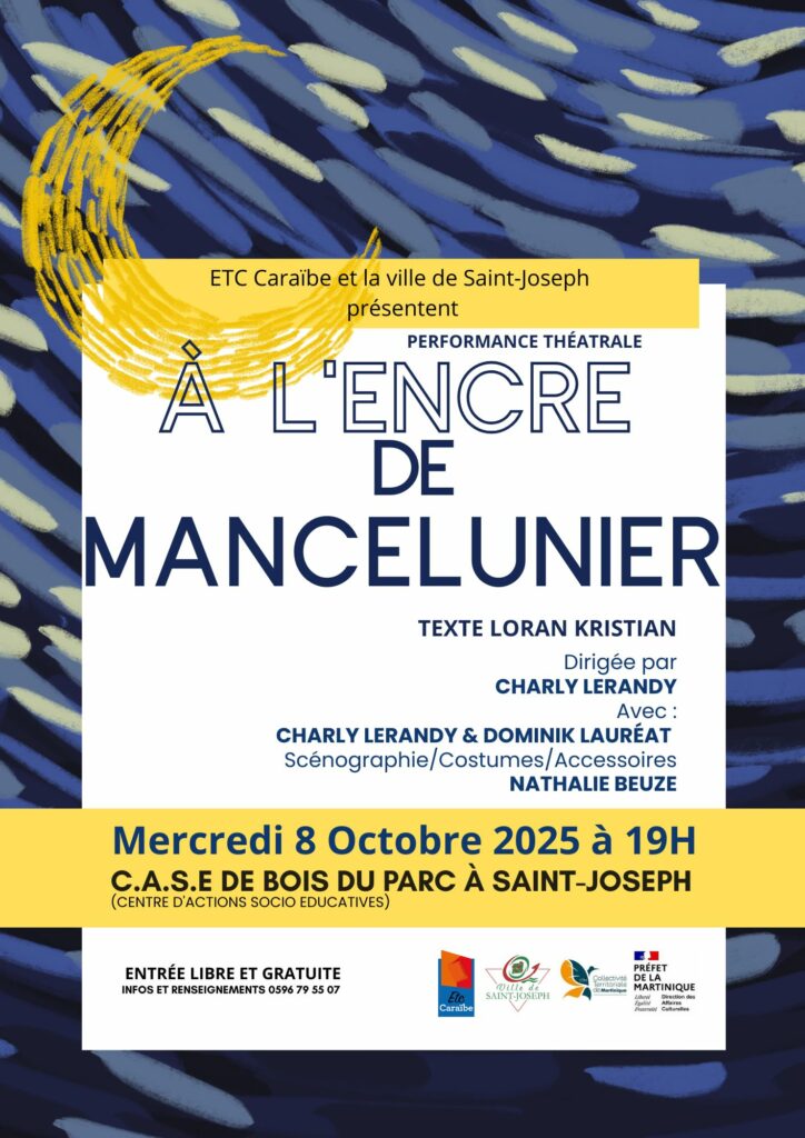 La Ville de Saint-Joseph vous convie à la présentation d’une performance théâtrale exceptionnelle intitulée “À l’encre de Mancelunier”, présentée par ETC Caraïbele mercredi 8 octobre 2025 à 19h, le C.A.S.E de Bois du Parc.